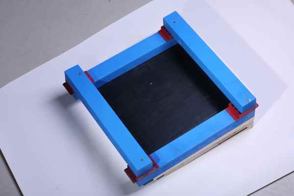 七、弹性橡胶垫安装:在下龙骨上以橡胶找平垫位置为基准,每间隔400mm安装弹性橡胶垫,用50气钉与下龙骨定固。